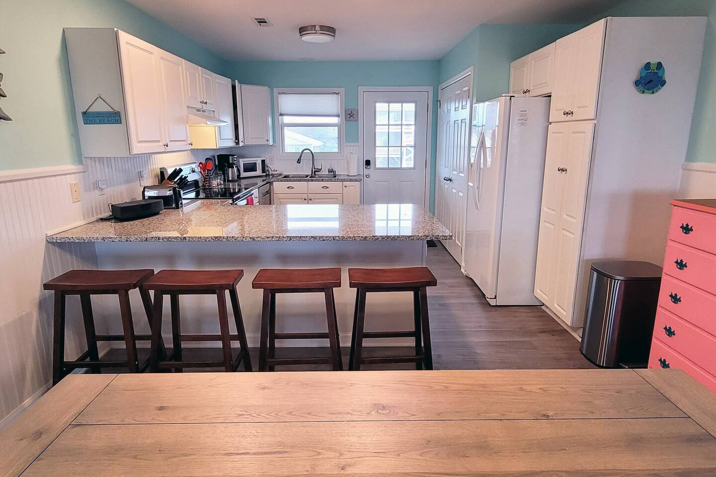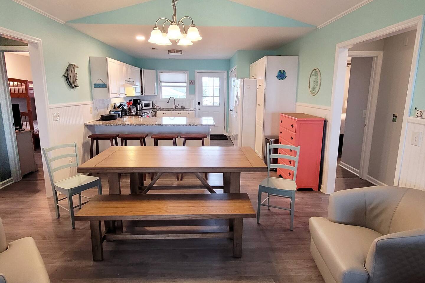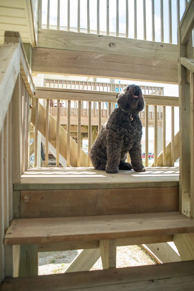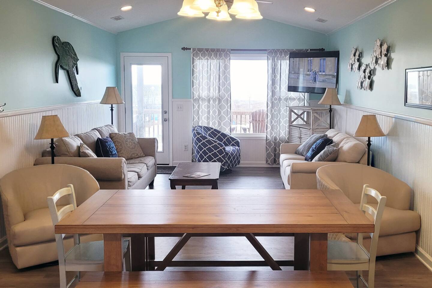 4 Bedroom, 2 Bathroom beach cottage on stilts, conveniently located just across from Ocean Crest Pier and has beautiful ocean views and easy beach access! 3 queen beds, 2 twin bunk beds (4 twin beds), pull out couch and pack-n-play make this house great for a family vacation. Booster seats provided. Outdoor shower with hot water allows you to keep the sand outside! We are dog friendly: pet fee of $100 for 2 dogs per stay.