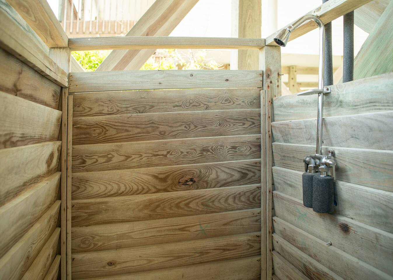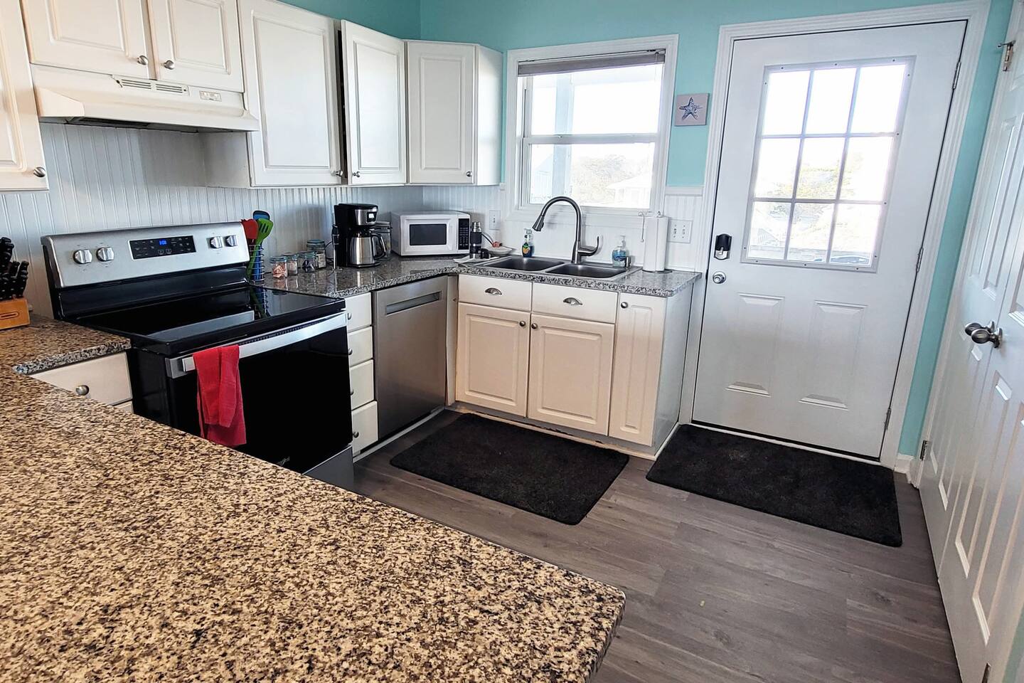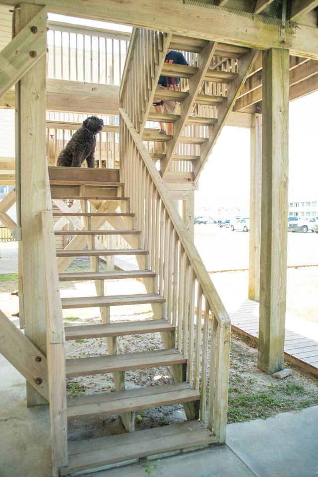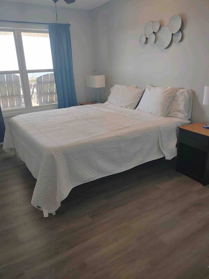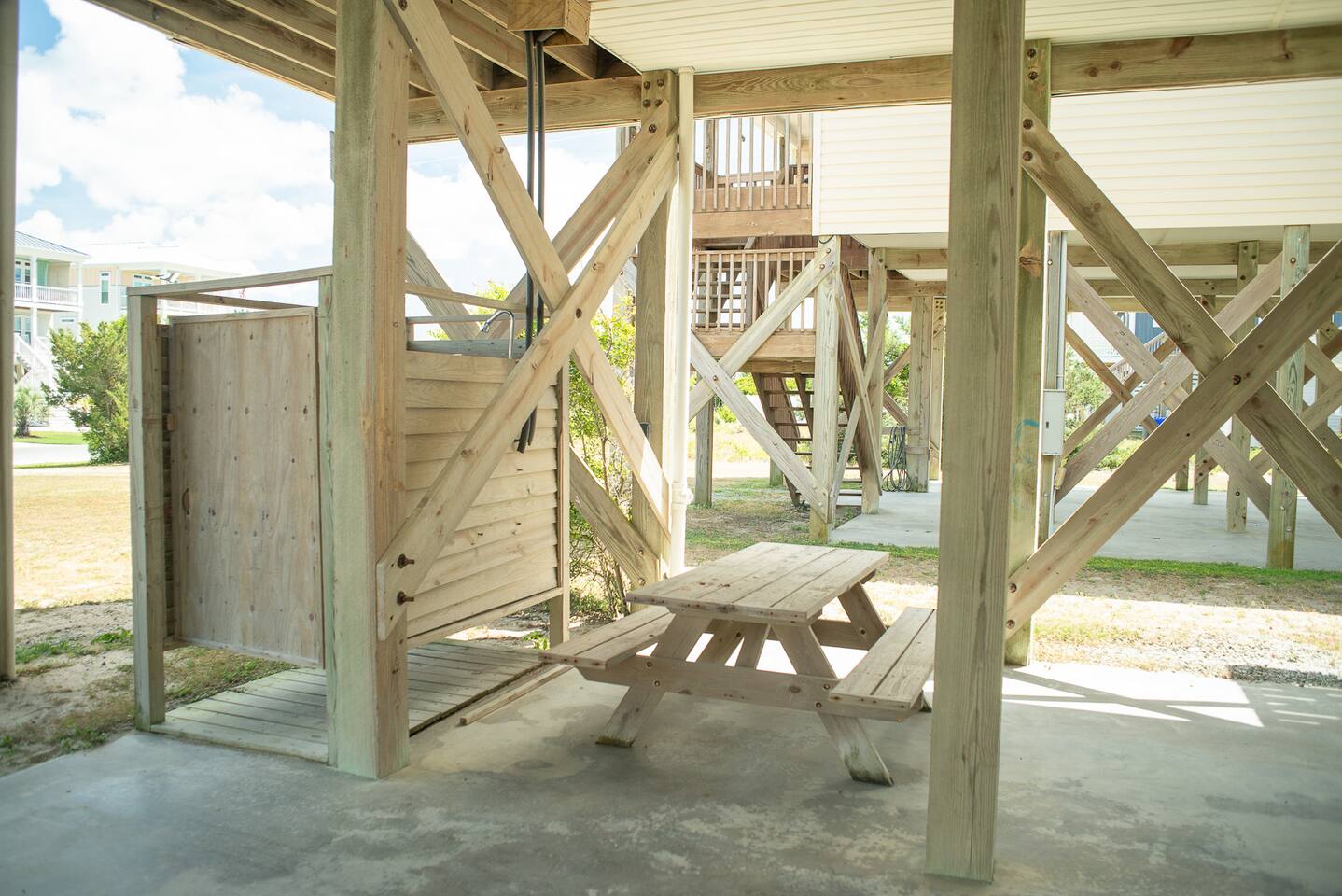 Open concept kitchen, dinning and living room look out to front balcony which has a great view of the ocean. Two bedrooms on either side of the house as well as a bath on either side between the two bedrooms. Back and front balcony's are gated at the top for safety of pets and children. Pets welcome- please pick up after pets. Outdoor enclosed shower with hot and cold water great for an extra shower area.