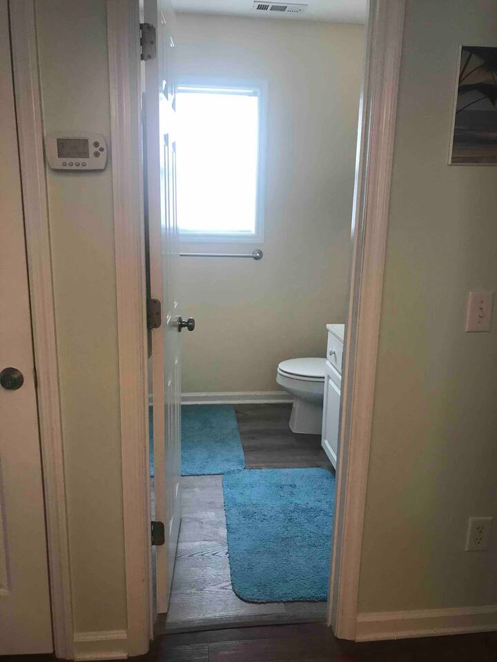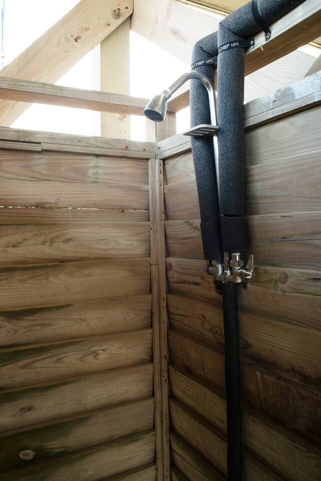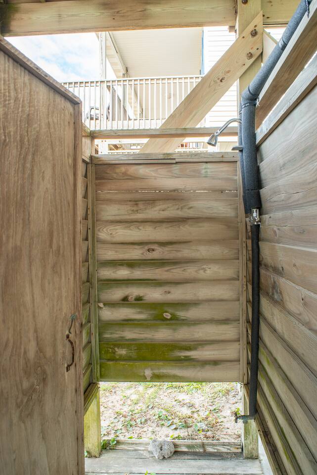 Open concept kitchen, dinning and living room look out to front balcony which has a great view of the ocean. Two bedrooms on either side of the house as well as a bath on either side between the two bedrooms. Back and front balcony's are gated at the top for safety of pets and children. Front stairs enclosed with a fenced area- please pick up after pets. Outdoor enclosed shower with hot and cold water great for an extra shower area.